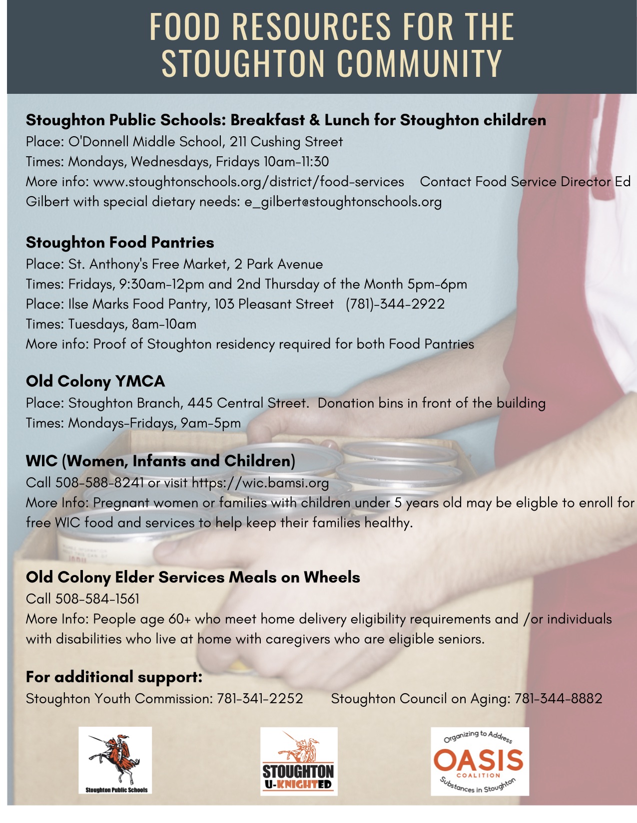 - Organizing to Address Substances in Stoughton (OASIS) is committed to continuing to provide resources for individuals and families during this time and beyond. If you are seeking a resource that you cannot find here, please contact us and we will do our best to help you!
